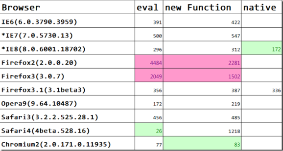 补充说明:new Function 创建的函数会被 JavaScript 引擎预编译,执行时跳过解释步骤,在 Gecko 引擎(Firefox)中编译优化更明显,因此性能优于 eval。