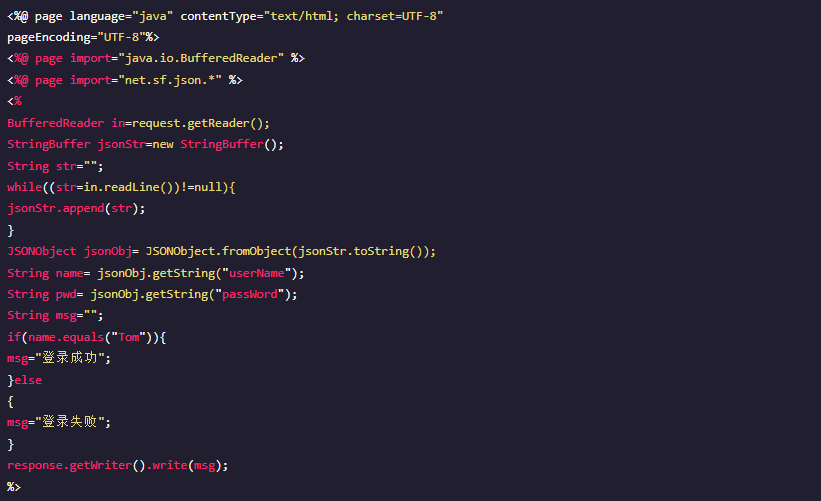 JSP 在接收前端 JSON 数据的场景中,优势尤为明显:无需额外配置 Servlet 映射,直接在 JSP 页面编写 Java 代码即可完成请求解析、业务处理、响应返回,开发流程简洁,无需繁琐的配置文件,适合快速开发简单的异步请求接口。